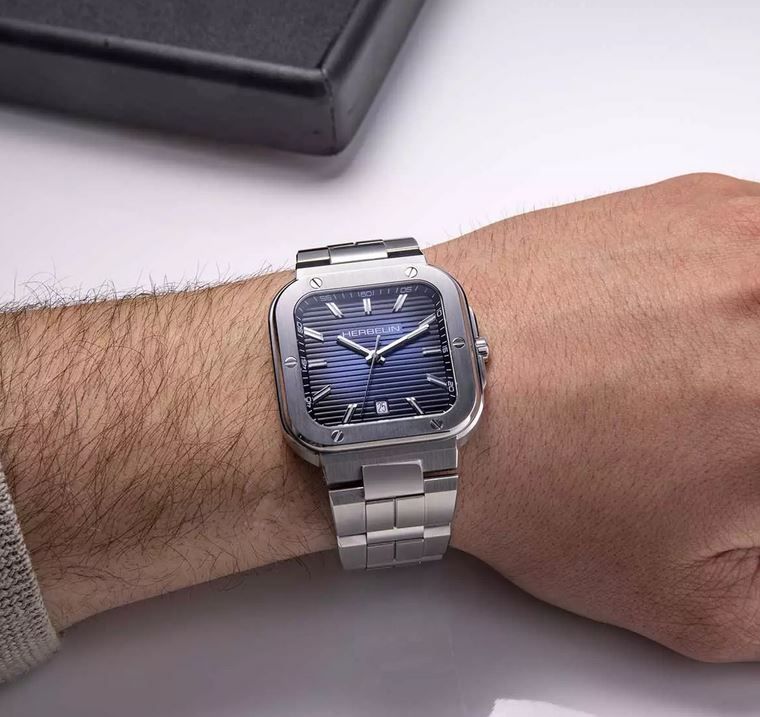 La collection Cap Camarat s'agrandit avec cette nouvelle forme de boîtier. Fabriqué en acier inoxydable, le boîtier est carré aux angles arrondis.